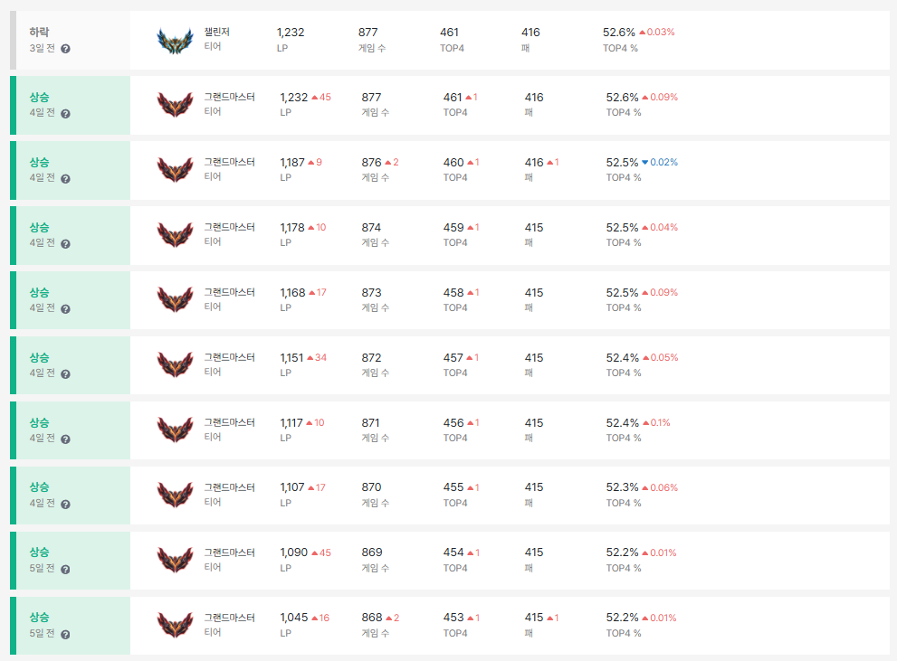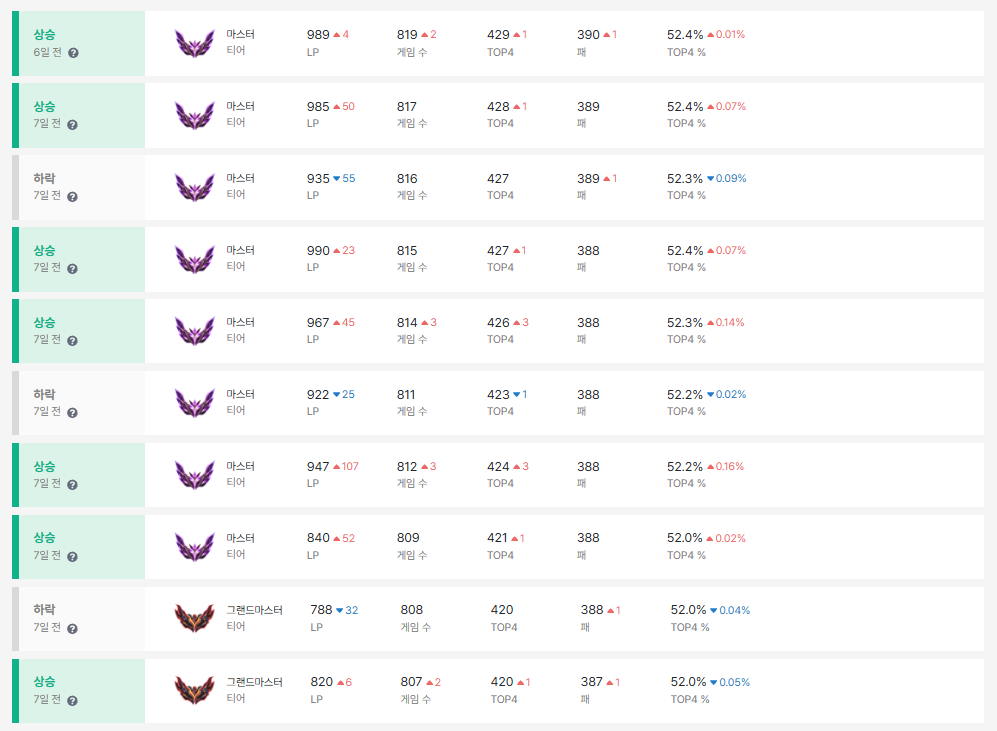 최상위 티어를 유지하기는 쉽지 않다. 매주 적용되는 패치를 통해 변경되는 메타를 계속해서 인지해야 한다.